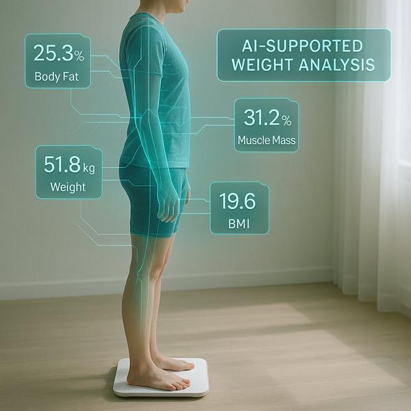 Der BMI ignoriert, wie sich Gewicht zusammensetzt. Muskeln sind schwerer als Fett, Wasseranteil schwankt, und hormonelle Zyklen verändern das Gesamtgewicht. KI-gestützte Modelle wie das Body Composition AI Model nutzen Sensorik (z. B. smarte Waagen, Kameras oder Wearables), um Körperfettanteil, Muskelmasse und Hydration dynamisch zu analysieren. Statt einer Zahl liefert die KI also ein Profil und dieses Profil ist die Basis für eine nachhaltige Gewichtsregulierung.